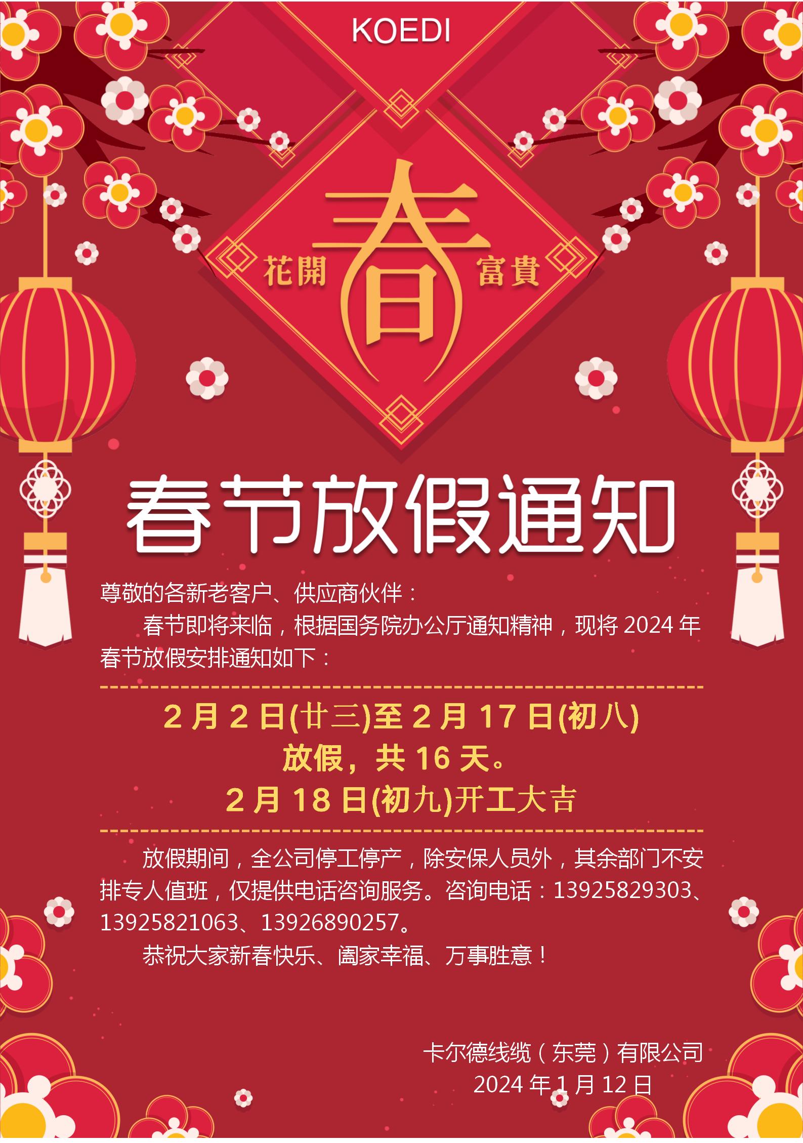 卡尔德线缆春节放假通知